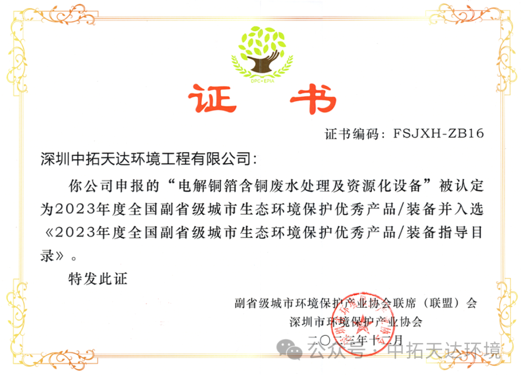 此次入選“2023年度全國副省級城市生態環境保護優秀產品/裝備目錄”,是行業專家對中拓環境在電解銅箔行業含銅廢水處理及資源化工作的肯定和認可,充分體現了中拓環境在該領域具有較強的技術創新能力和項目實施能力。中拓環境作為工業水處理一站式解決方案服務商,將繼續緊密圍繞客戶的需求,針對重金屬廢水處理的難題將加大技術攻關,為客戶提供“低耗、高效、智慧”的解決方案,打造更多、更好的產品/裝備。